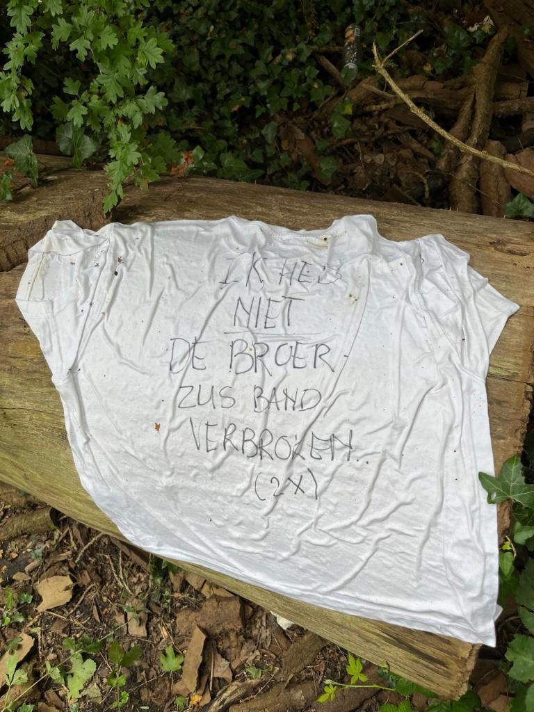 In het Oeverbos naast de Amstel waar ik met hond M liep, lag een nat wit T-shirt op een boomstam. ‘Ik heb niet de broer-zus band verbroken (2x)’ stond erop. Vooral dat (2x) intrigeerde me. Was het een regel uit een lied, dat twee keer gezongen moest worden? Hoorde de zin in een gedicht thuis en werd het herhaald? Of was de zin gewoon te lang om twee keer op een shirt te schrijven? En wat bedoelde de schrijver er mee?
