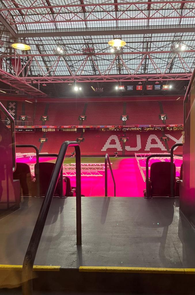 Bij de aanmeldbalie werd meteen duidelijk dat ik niet in het systeem was opgenomen. Er moest een mannetje met een hogere functie aan te pas komen om mij binnen te laten. Ontspannen en tevreden hing ik het stemkastje om m’n nek. Voordat ik de zaal binnenliep, gluurde ik door de skybox deuren het stadion in. Direct boven het veld hingen talloze lampen. Het heilige gras lichtte roze op. Waarom die kleur? Was roze misschien goed voor het groeiproces? In de vitrines naast de ingangen van de skyboxen stonden bekers en schalen van afgelopen kampioenschappen tentoongesteld. Blinkend allemaal, maar ook veel te lang geleden.
