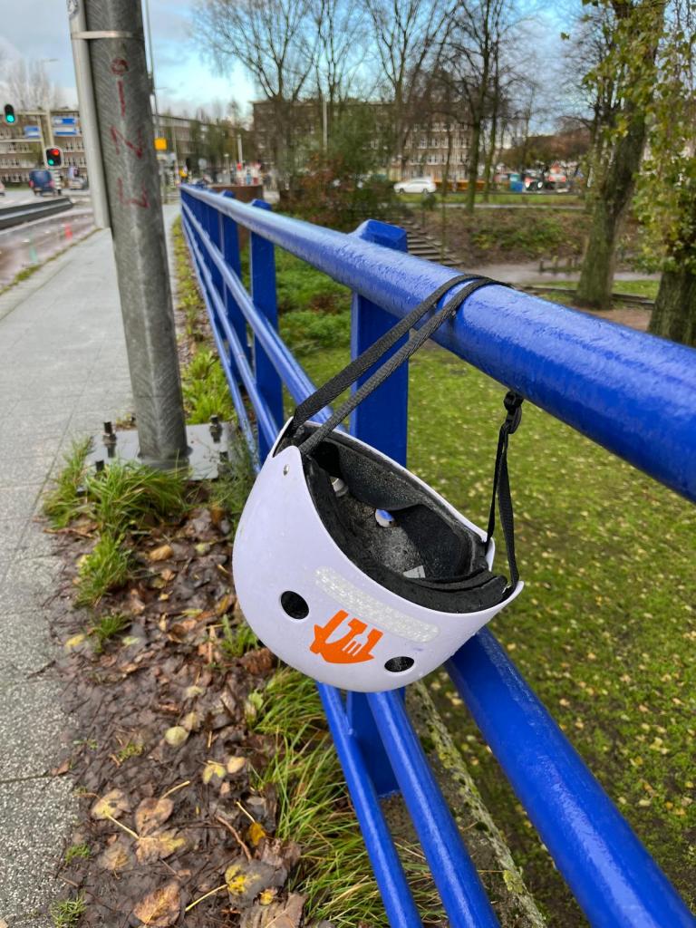 Ja, de Utrechtsebrug, daar begon het mee. Daar hing, netjes vastgeklikt aan de reling, een helm met het logo van Thuisbezorgd erop. Had iemand ’m gevonden en een soort van opgeruimd? Maar hoe vergeet of verlies je zoiets groots als een helm? Was de bezorger het helemaal zat om dat ding op te hebben na een lange dag van hot naar her rijden? Had ie op de brug even pauze genomen, zijn helm afgedaan – zijn helm, ja, want ik heb nog nooit een vrouwelijke thuisbezorger gezien – om, ja om wat? Op z’n hoofd te krabben? Zich onderwijl afvragend hoe ie verder met z’n leven moest?